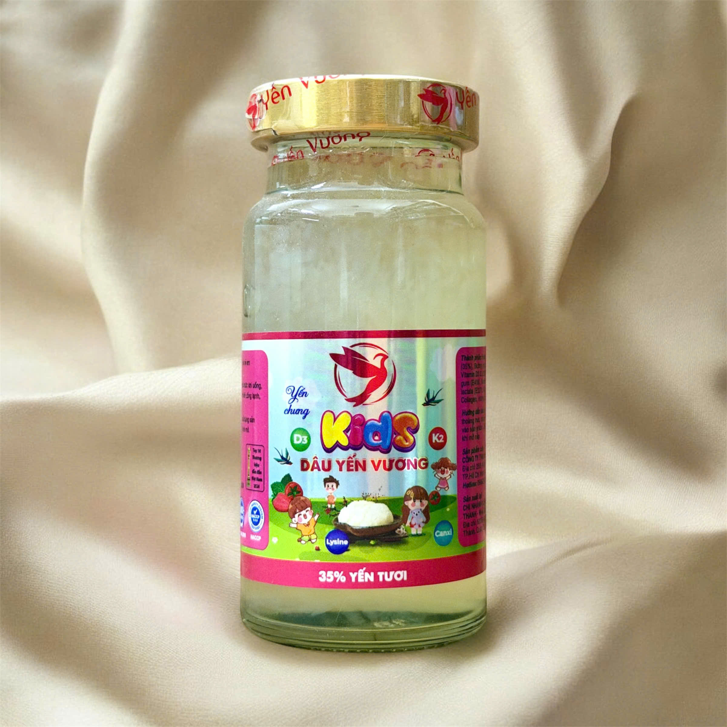 Thành phần: Nước, đường phèn, đường, chất làm dày (INS 415, INS 418, INS 327), chất ổn định (INS 407, INS 401), yến khô (25 mg/70 ml)[tương đương yến sào ngâm nở (250 mg/70 ml)], taurine (30 mg/70 ml), L-lysine hydrochloride (30 mg/70 ml), hương liệu tổng hợp (hương yến, hương dừa, hương dâu), chất tạo ngọt (INS 955) tổng hợp, chất tạo màu (INS 171) tổng hợp.